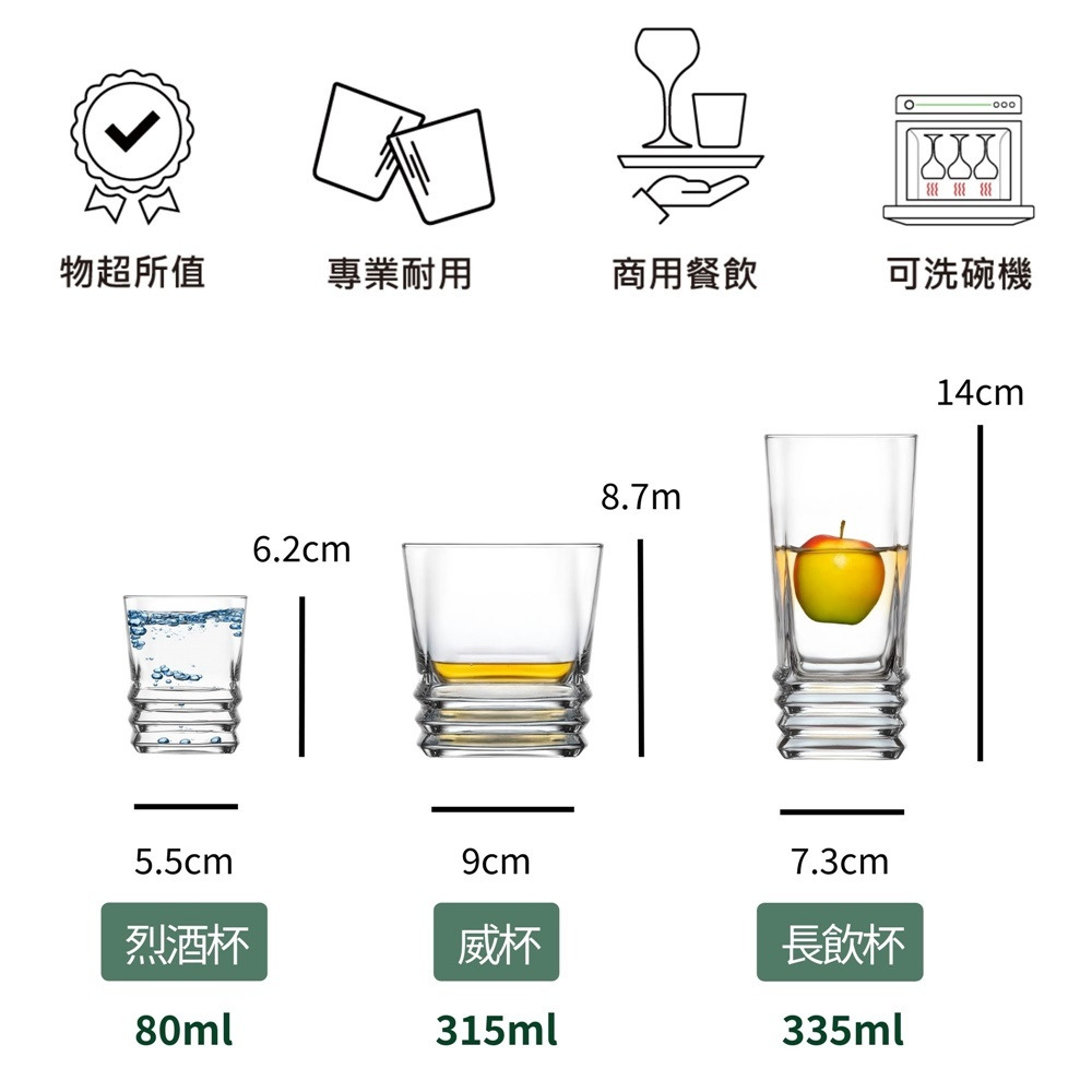 賽維亞細緻系列以 簡約杯型與厚實平底設計,手感穩定、耐用實用,是調酒與烈酒的經典杯款。