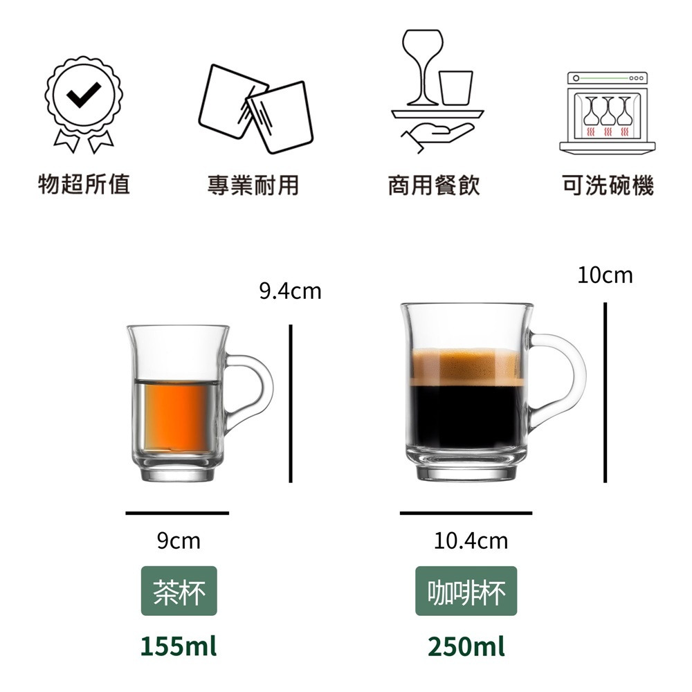 250cc咖啡杯適合濃縮或拿鐵,155cc茶杯適合花茶或單杯茶飲